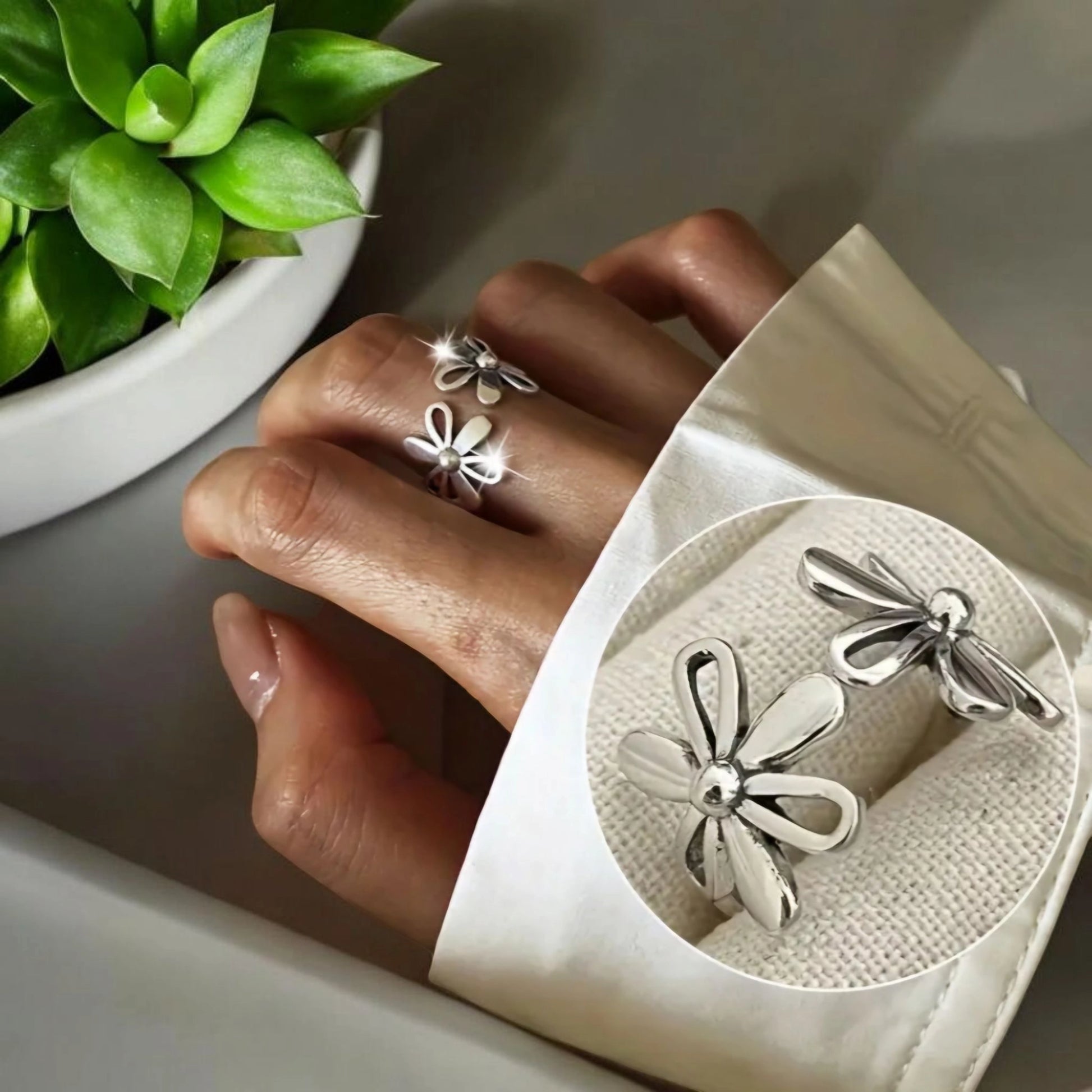 Fabriquée en argent 925, elle est ajustable à toute taille de doigts. Les fleurs mesurent 14 mm de diamètre.
