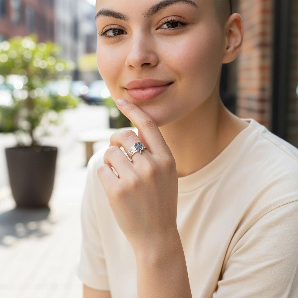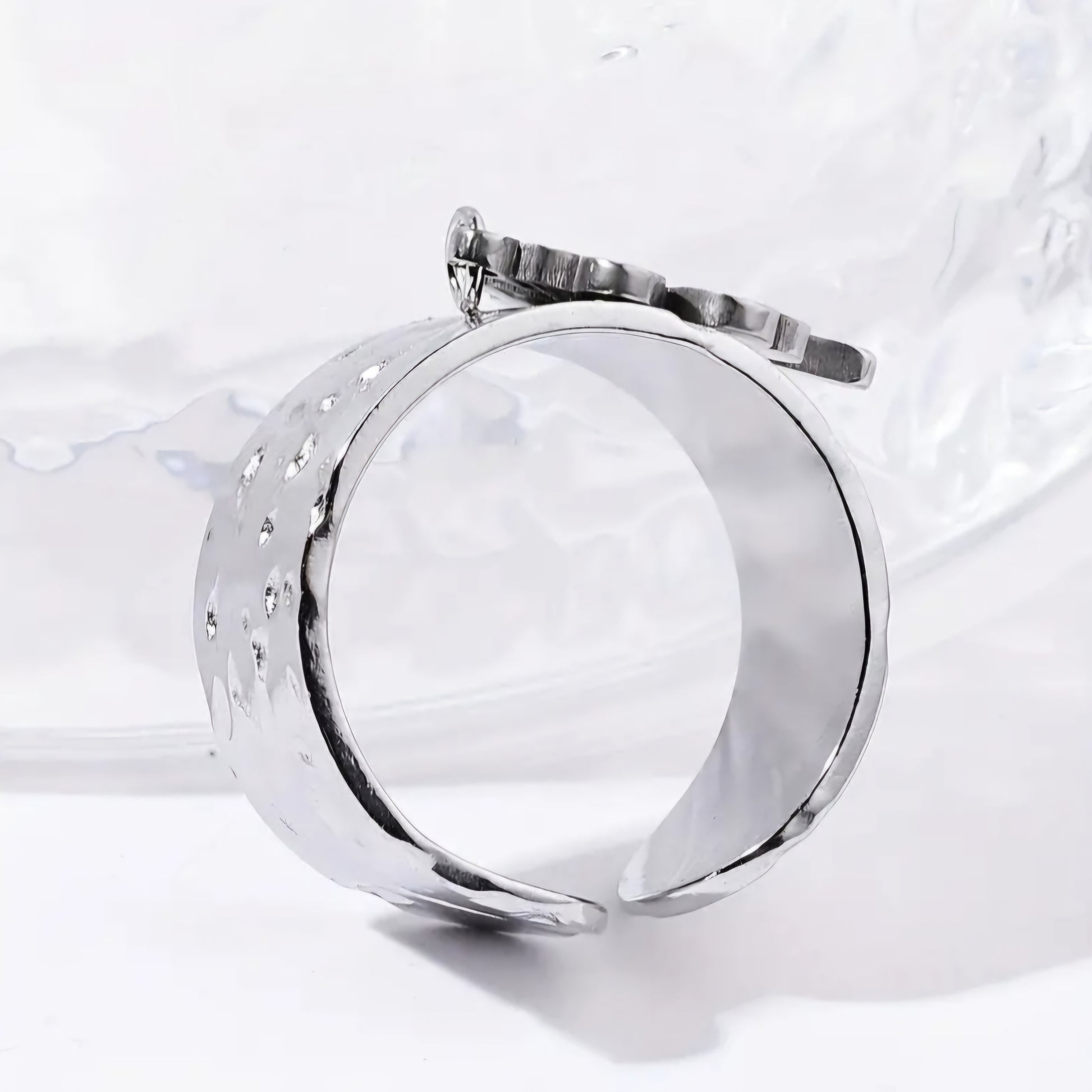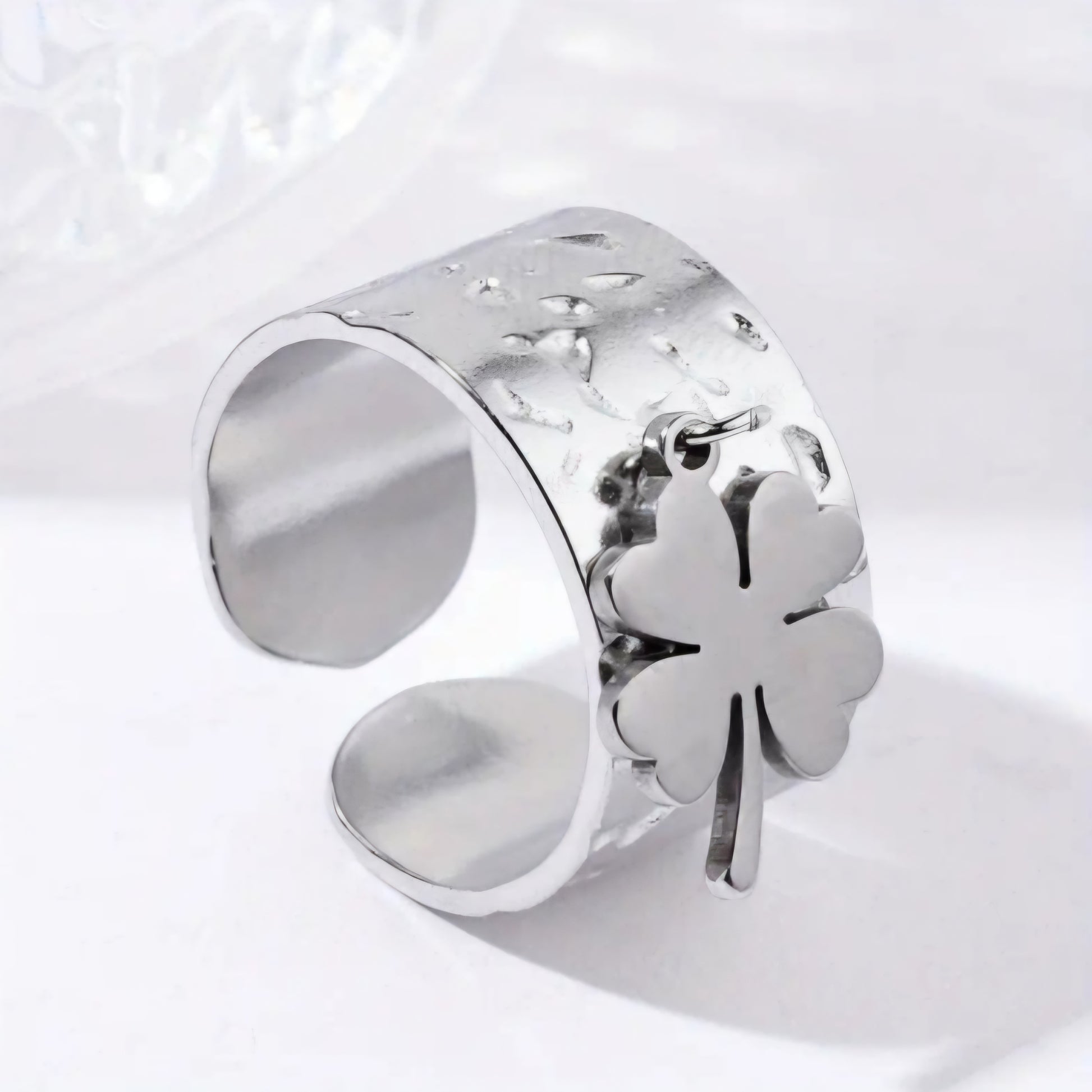 Découvrez notre bague breloque AVA en acier inoxydable, ornée d'un motif de trèfle stylisé. Ce bijou unique allie élégance et symbolisme, en représentant la chance et la prospérité. Parfait pour celles qui recherchent un accessoire mode avec une touche de signification personnelle.