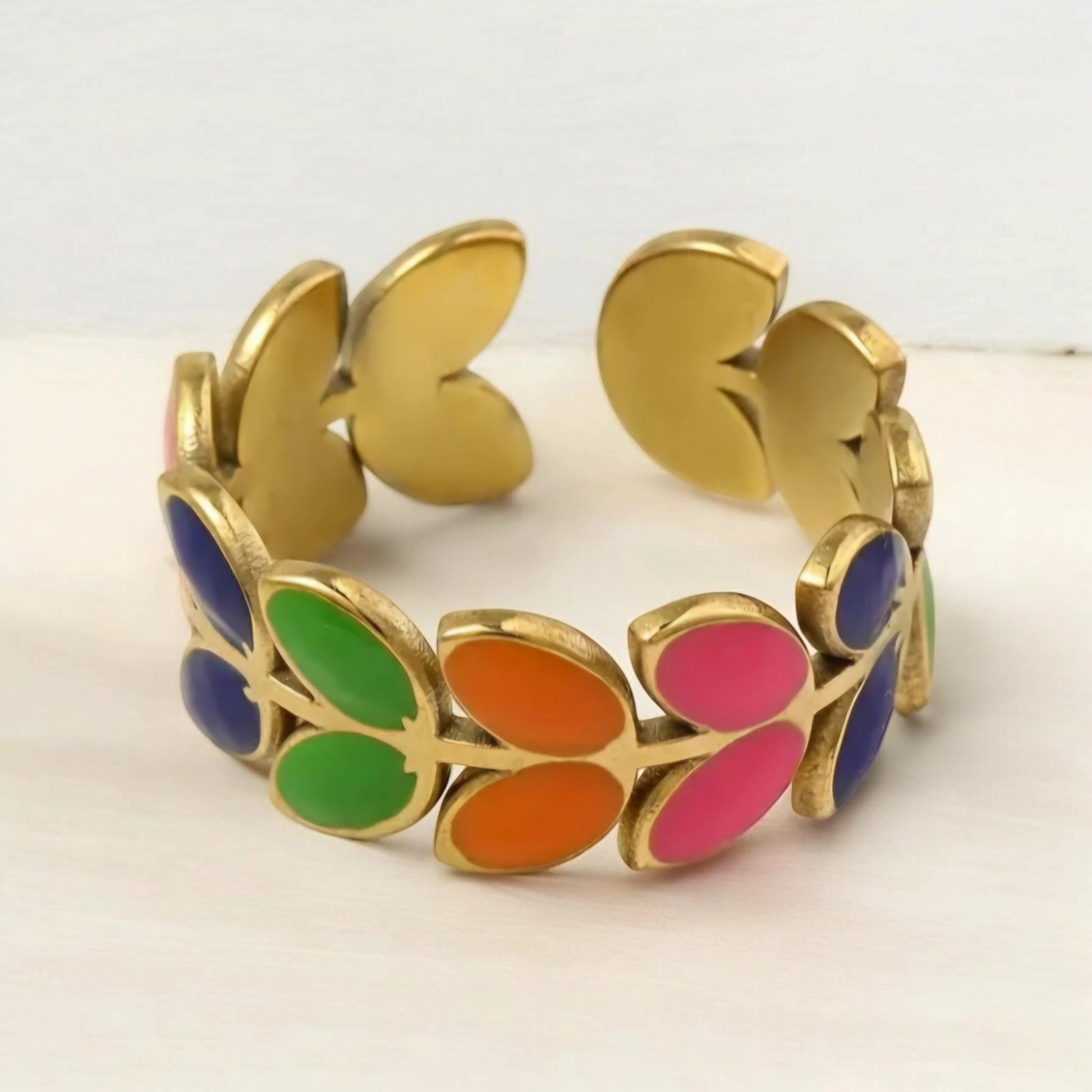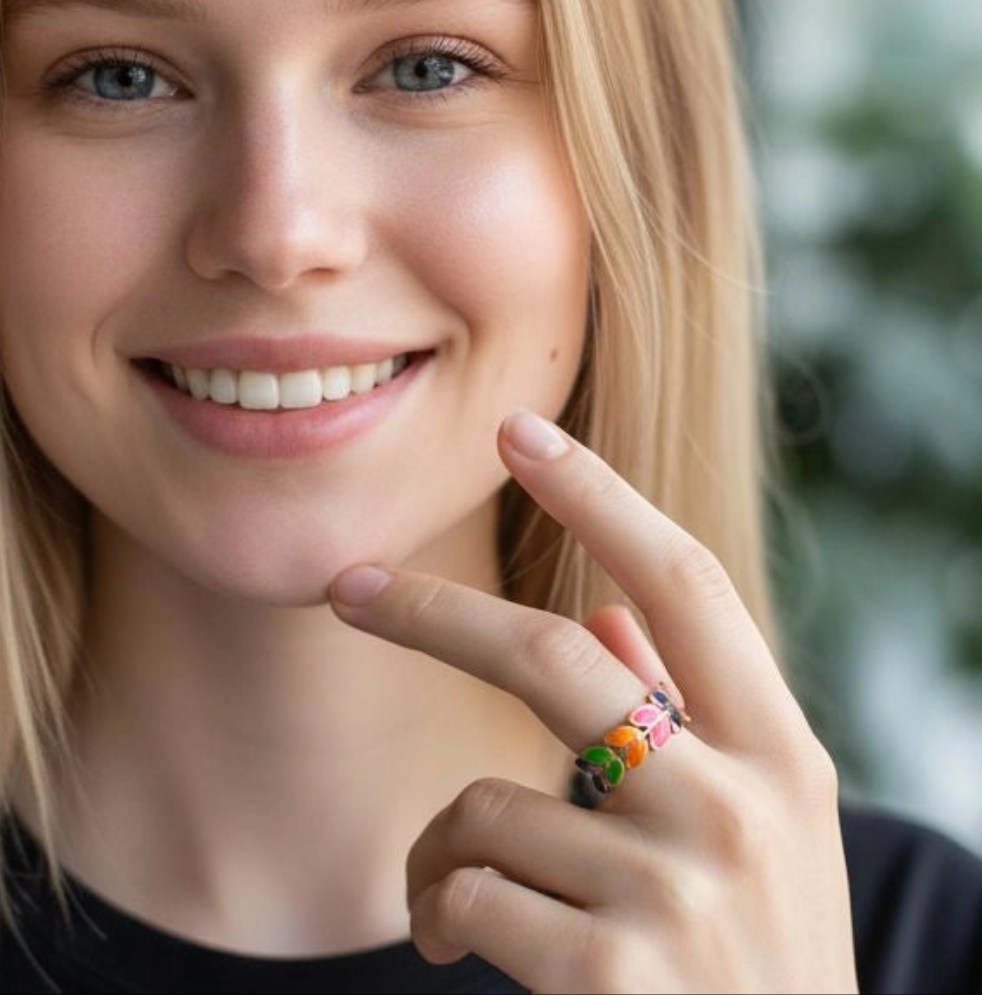 Toute en couleur et dorée, MARGAUX vous ira comme un gant. Elle s'adapte à toute taille de doigts et elle est fabriquée en acier inoxydable.