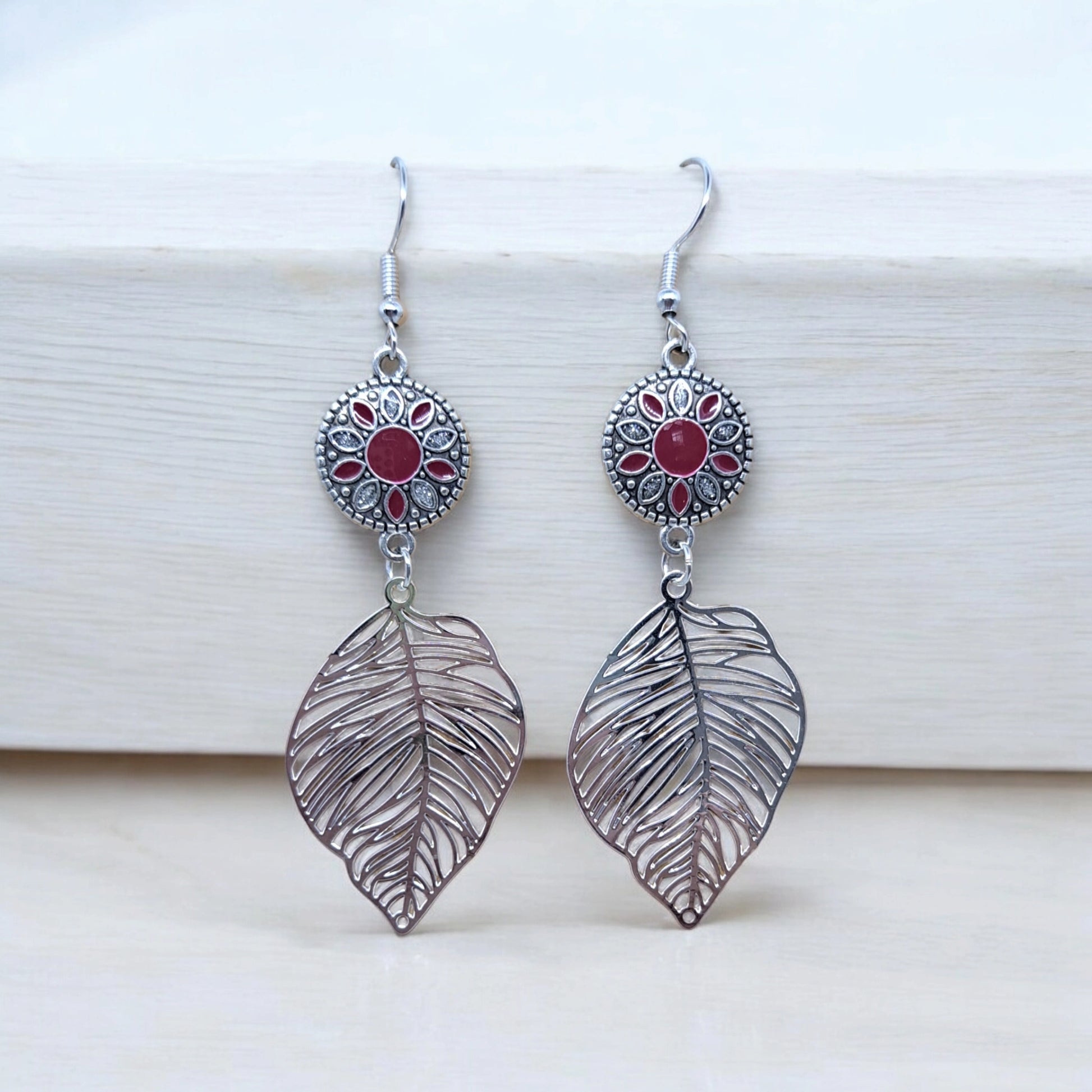 Symboles du bonheur et de la prospérité, ces boucles d'oreilles DIANE aux feuilles argentées se mêlent avec chic aux fleurs à pétales rouges foncés.