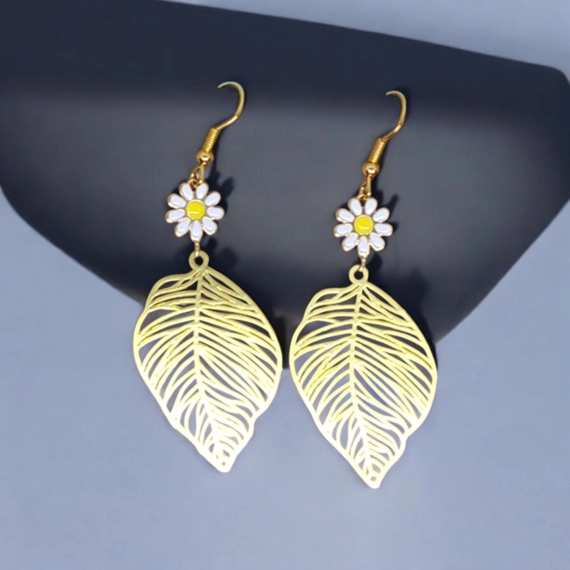 Symboles de la renaissance et du printemps, ces boucles d'oreilles JOSY aux feuilles dorées se mêlent avec chic aux fleurs de pâquerettes.