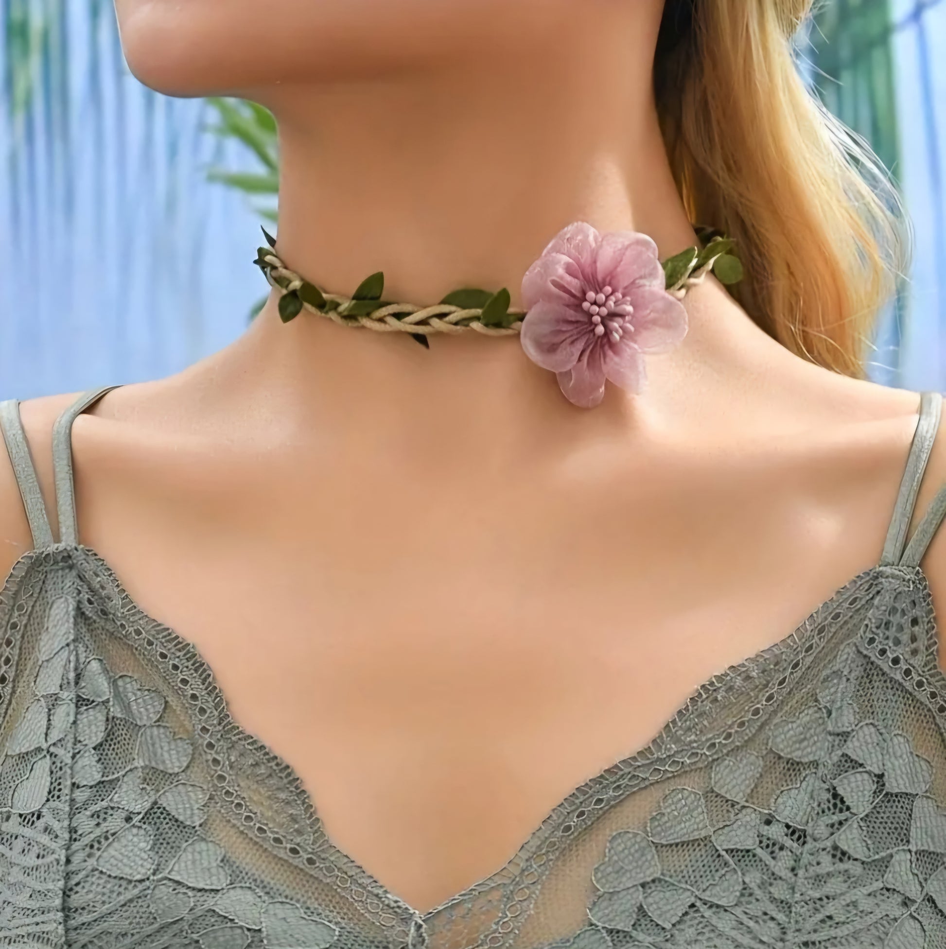 ANNABELLE est un collier ras du cou en cordura et tissu à grosse fleur rose.