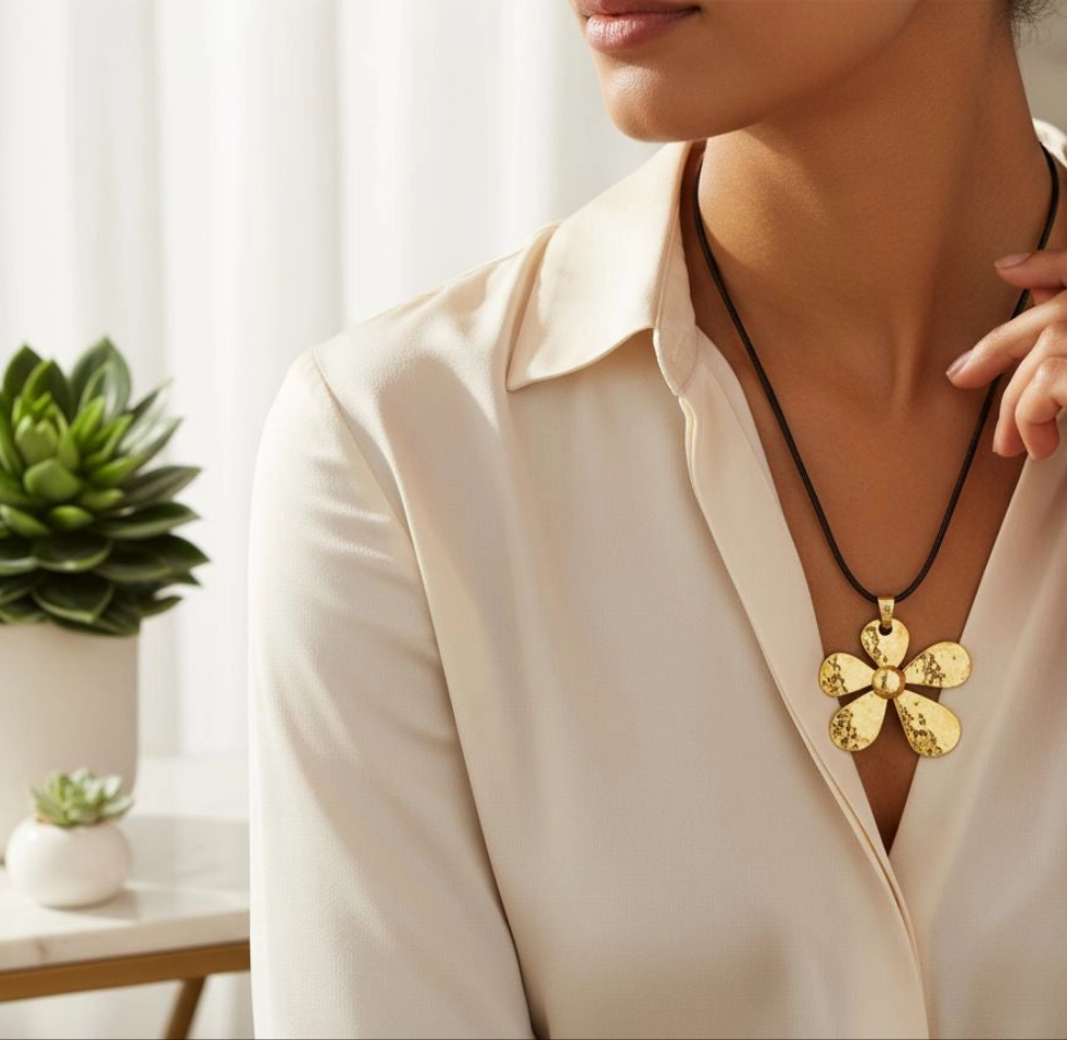 Exprimez votre style unique avec ce collier pendentif en forme de fleur dorée. Un bijou fantaisie élégant qui combine simplicité et charme artisanal, parfait pour toute occasion.