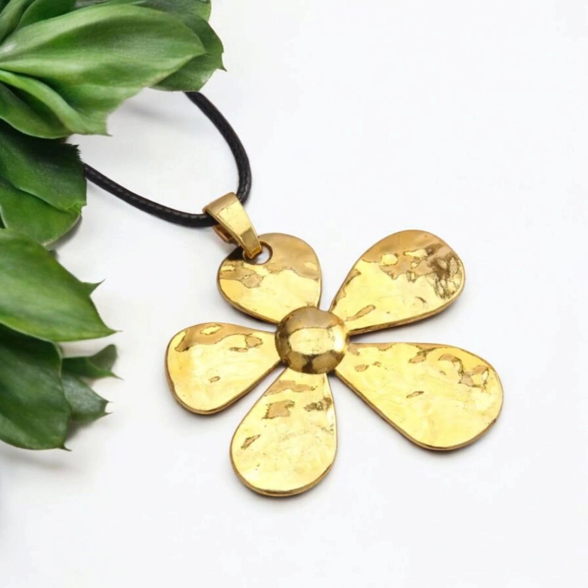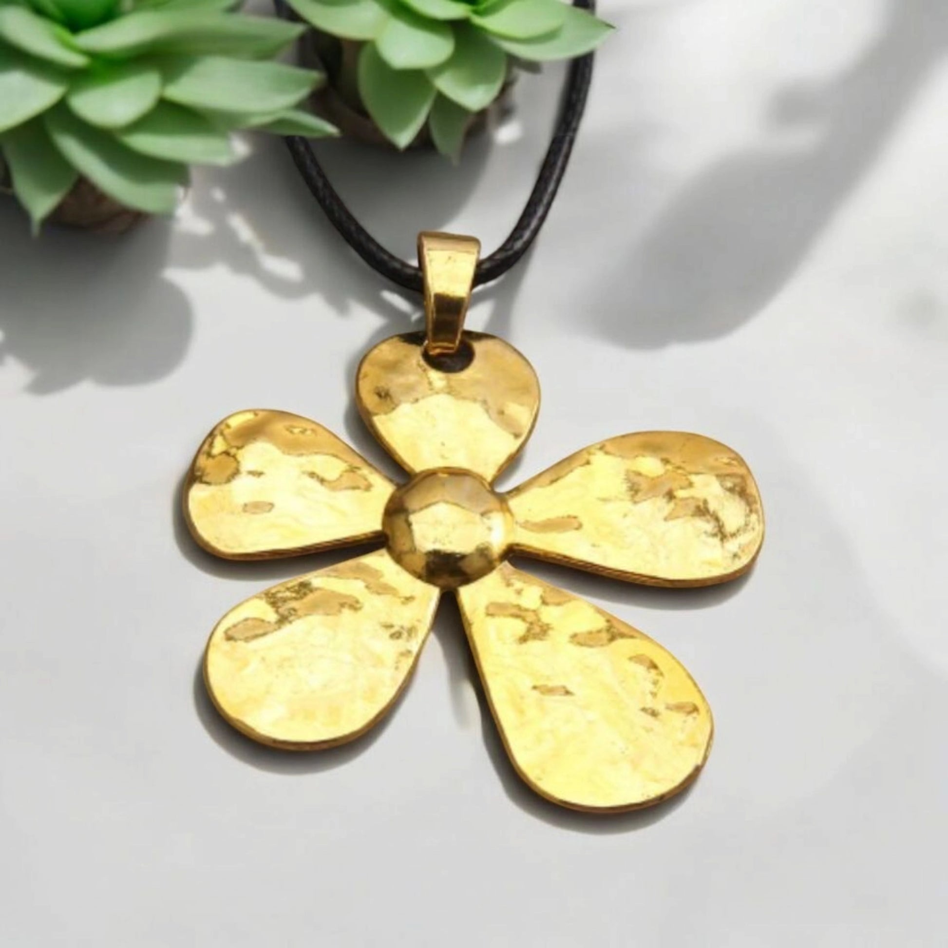 Ce pendentif en fleur est fabriqué en métal martelé sans nickel, offrant une texture unique et un éclat doré qui attire le regard.