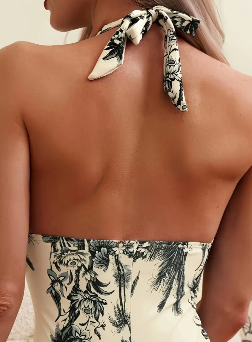 Le tissu doux et extensible est orné d’un motif tropical luxuriant, avec des palmiers et des feuillages dans des tons de vert sur un fond crème, apportant une touche de fraîcheur et d’exotisme à votre look. La taille haute accentue la taille, offrant un confort et une allure chic.