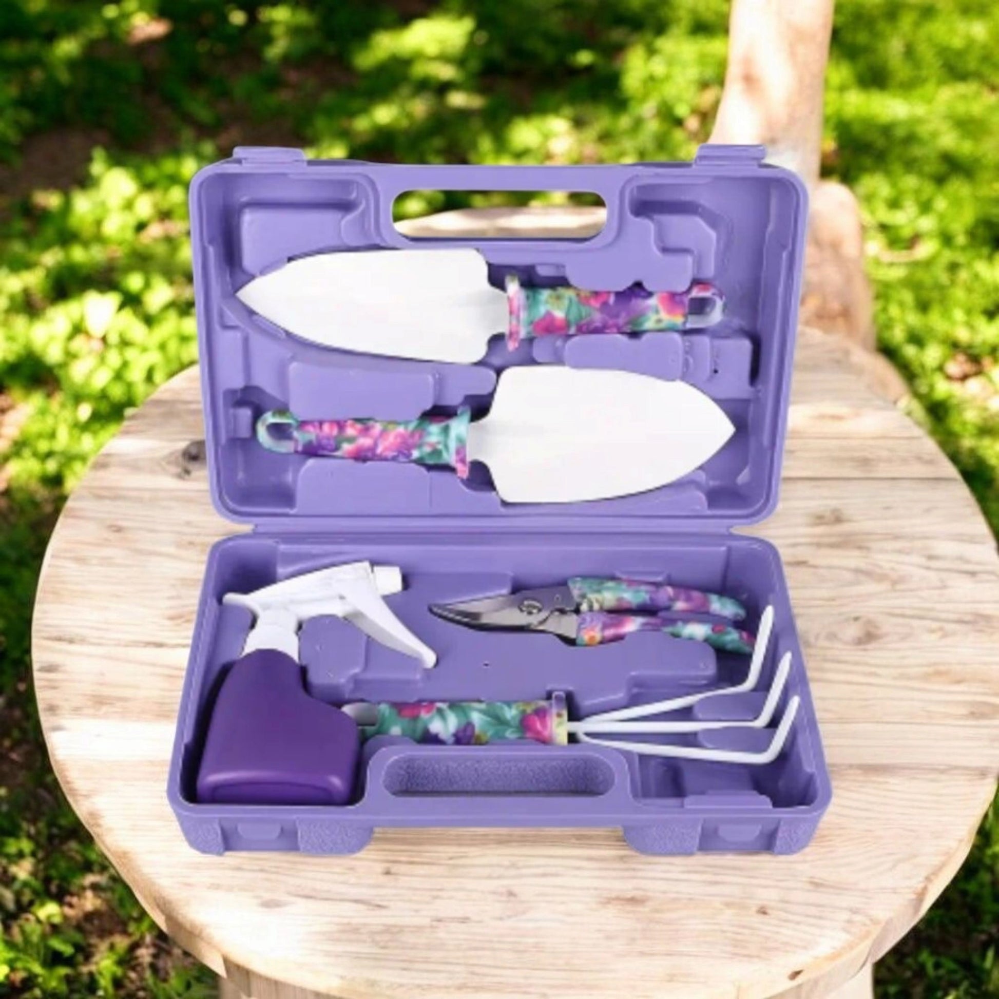 Le tout est rangé dans une mallette robuste et légère de couleur violette, avec un design floral coloré sur les poignées, apportant une touche de gaieté à votre expérience de jardinage. Compacte et facile à transporter, cette mallette est le compagnon idéal pour vos séances de jardinage, que ce soit à la maison ou à l'extérieur.