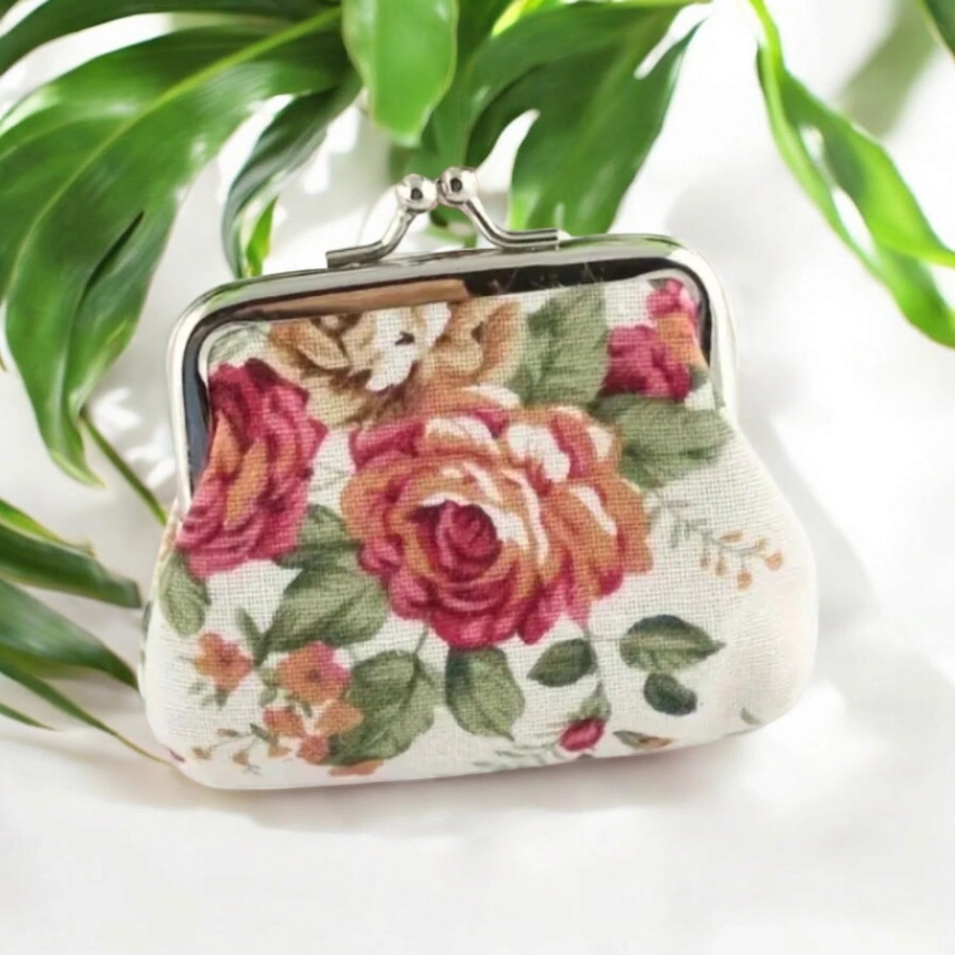 Ce charmant porte-monnaie allie style vintage et romantisme avec son imprimé floral délicat. Sur un fond blanc, des roses aux tons rose profond et pêche s'épanouissent parmi des feuillages vert tendre, créant un motif élégant et intemporel.