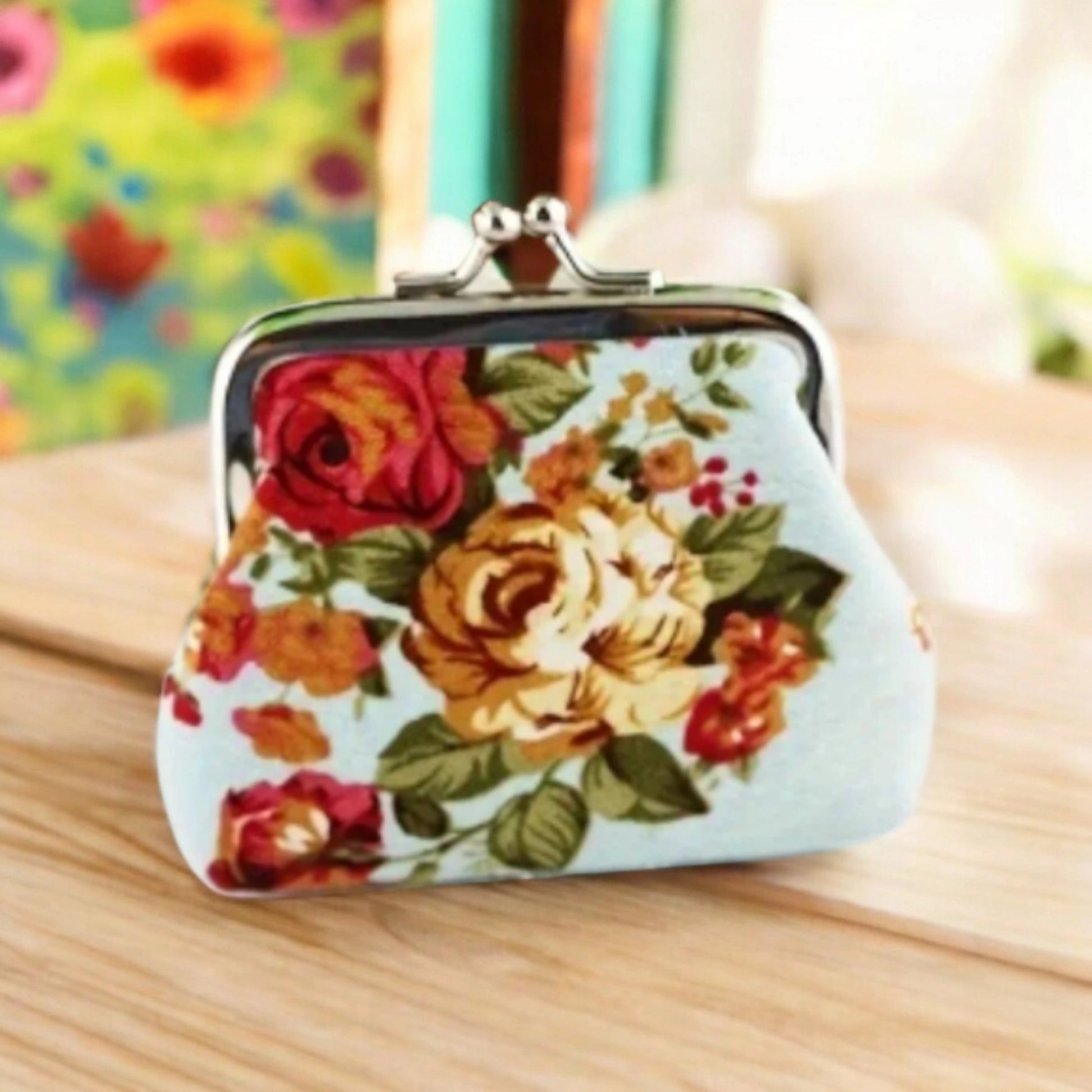 Charmant porte-monnaie vintage orné d'un magnifique motif floral sur fond bleu clair. Les roses aux tons chauds - rouge, orange et crème - s'entremêlent délicatement avec des feuillages vert olive, créant une composition romantique et colorée.