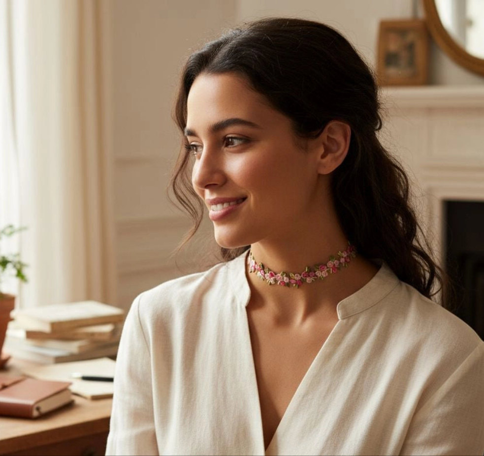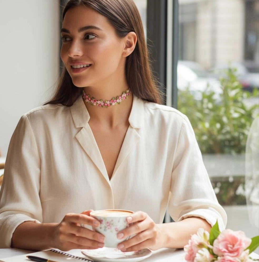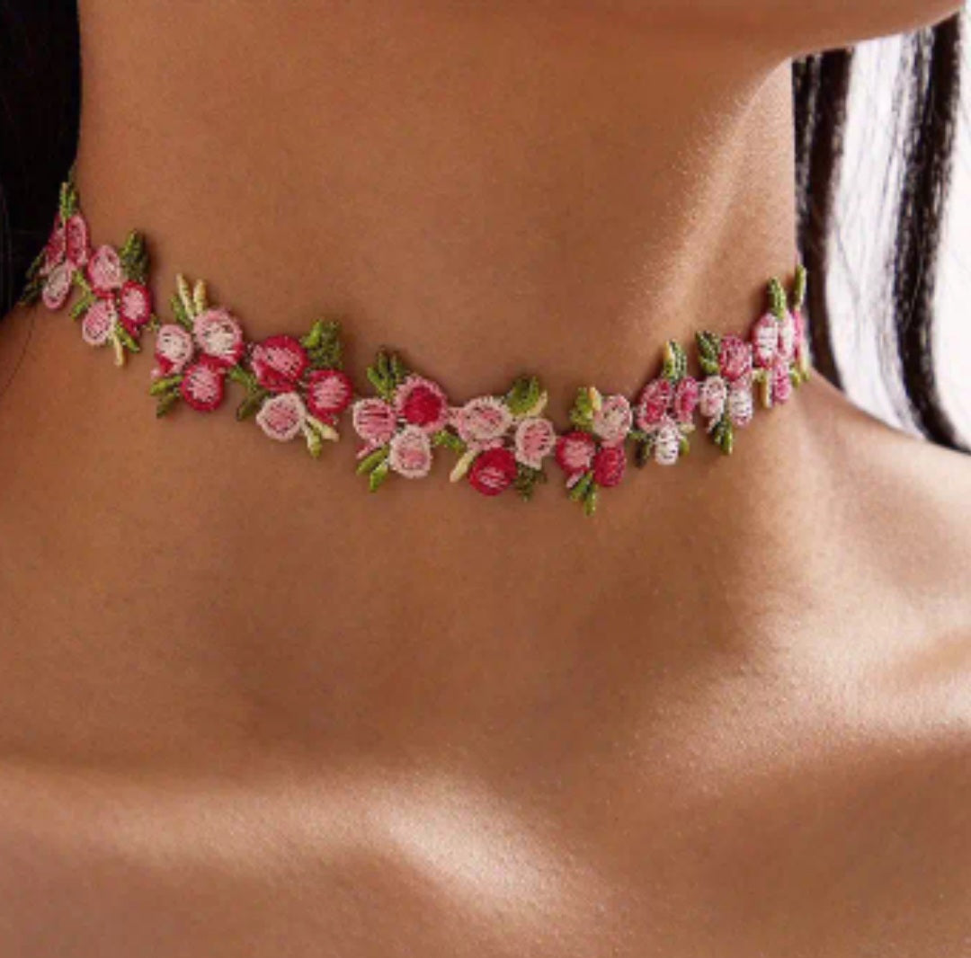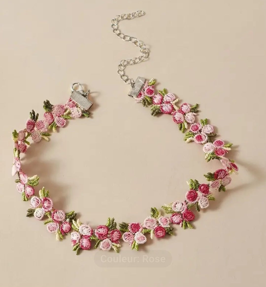 - Design Floral : Ce ras-de-cou présente un motif brodé de fleurs roses et vertes, capturant l’essence de la nature avec élégance.
